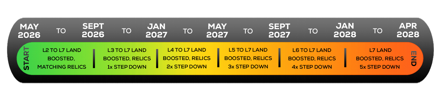 This pattern continues in four-month stages until eventually only Level 7 land still has a small Ember-level boost, and then the land-based Relic bonuses end entirely.