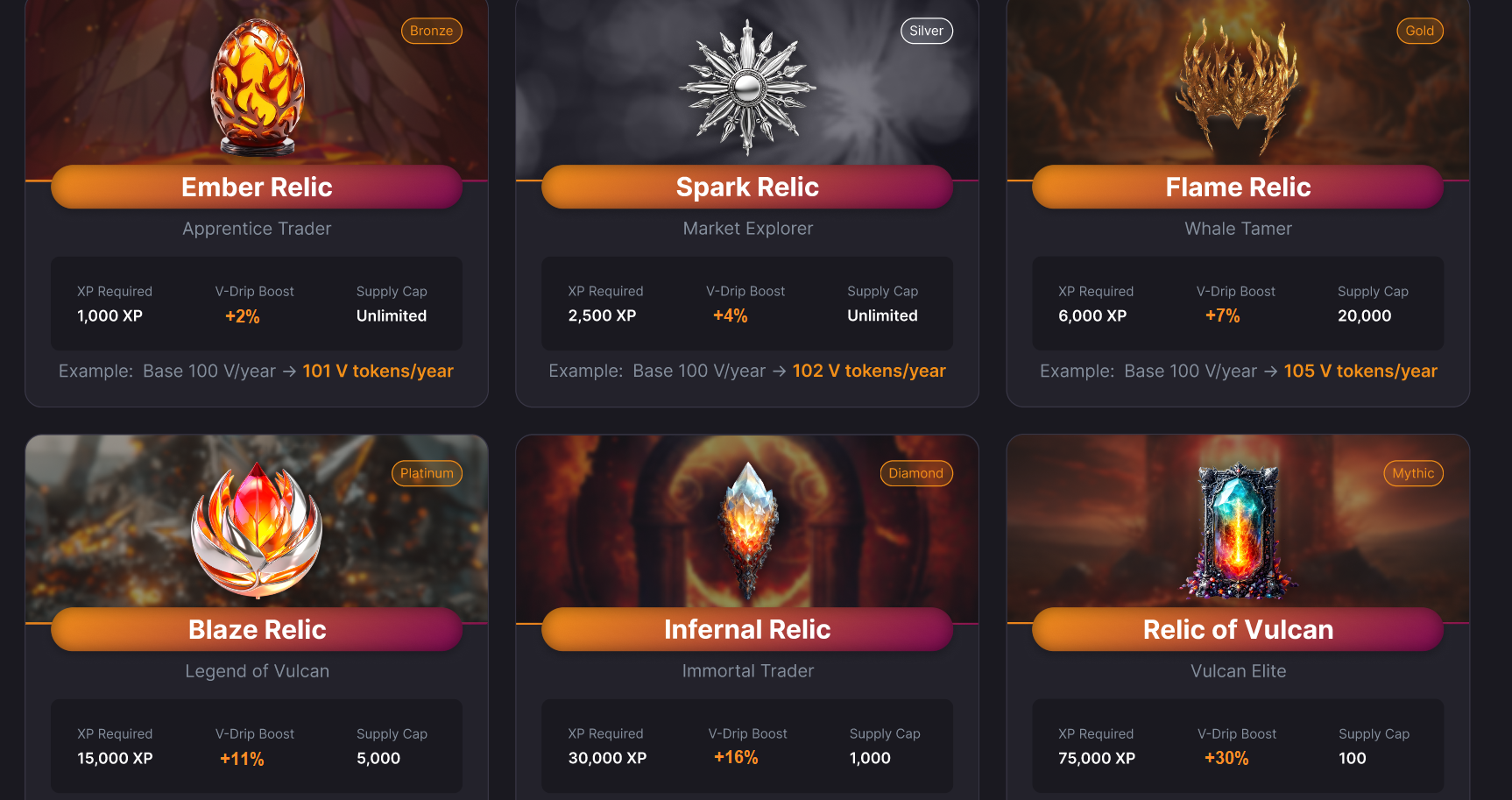 Relic NFTs on VulcanX grant a percentage boost to your daily V earnings. The higher the Relic tier, the higher the boost – from the Ember Relic at +2% up to the Relic of Vulcan at +30%.